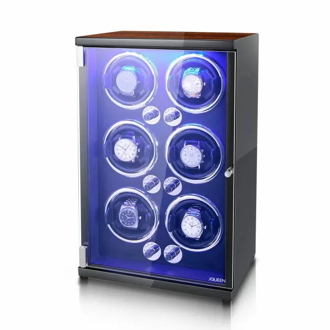 6 Piece Watch Winder for Automatic Watches, Walnut Paint LED Watch Winder with Quiet Japanese Motor, Open The Cover and Stop, 5 Working Modes