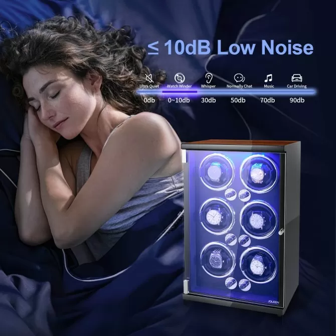 automatic watch winder is driven by a Japanese super silent motor, with noise as low as 5 dB to rotate your watches quietly and safely, with no running noise. The elegant LED light effect makes your watch impressive at any time