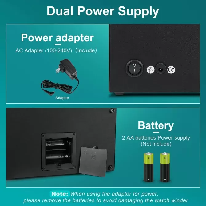 Watch Winder Powered by 100-240V AC Adapter(included) or 2*1.5V DD battery (not included). Note: Only one type of power supply can be used when powering the single watch winder.