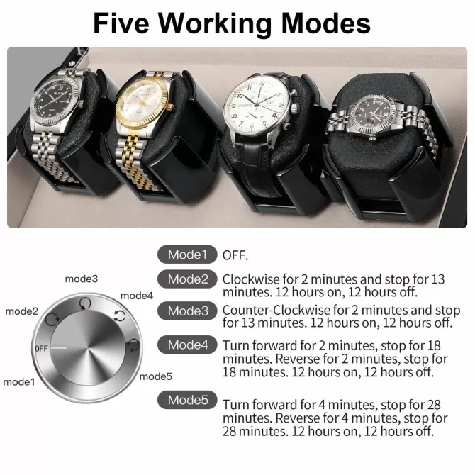 There are 5 modes to adjust the winding way that can match different brand of watches.