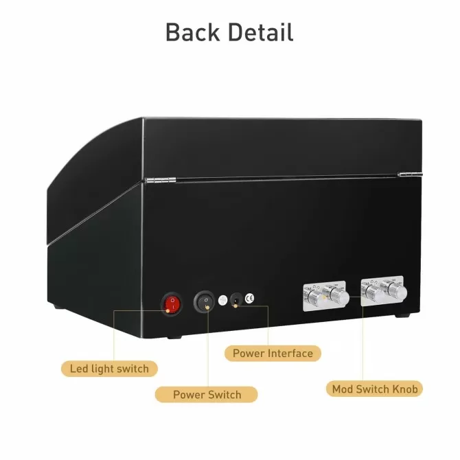 There are 2 knobs to set up winding, one is direction rotation knob which has off, clockwise, counter-clockwise, alternating clockwise/counter-clockwise, 6 hour-delayed and another is TPD setting knob which can set up 650, 750, 850, 1000, 1950 TPD. These modes can keep your watches running more accurately.