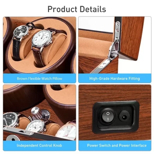 The watch winder is made of high quality wood, which is environment-friendly, and has exquisite wood grain, while the pillow is made of leather which is soft and can protect watch well.
