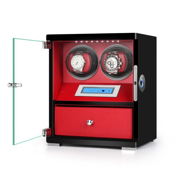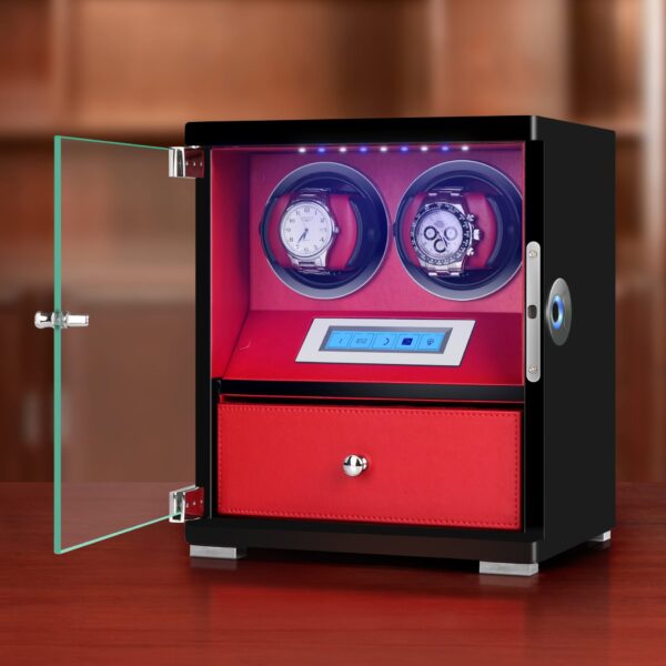 This wooden watch winding box is made of soft and durable microfiber leather, and its surface is treated with mirror-like piano paint, giving it a stylish and refined appearance. Designed in two classic colors and multiple watch winder: black and red for single and multiple watch, easy to choose. The newly upgraded semiconductor fingerprint recognition of this luxury automatic winder for watch is faster and safer. The killing rate of ultraviolet germicidal lamp is 99%, which can effectively prevent the spread of bacteria. It adopts a new generation of constant speed silent motor and fully enclosed design, so it operates quietly without causing interference. Smart touch screen design, more flexible and convenient.