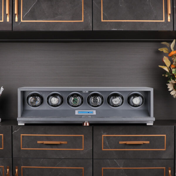 MDF wood with a sleek piano-painted finish and adorned with exquisite Acrylic accents, this fingerprint mechincial watch winder exudes opulence. The inner sanctuary, lined with plush microfiber leather, cradles your watches in utmost delicacy. Enjoy the convenience of our smart touch screen, LED ambient light, and an access control system, ensuring a seamless and stylish experience. The addition of a fingerprint lock elevates security, offering both functionality and sophistication. Experience the epitome of mechanical elegance as your timepieces are showcased through the round viewing window. URORO sets the standard for 6 watch winder box that defines indulgence.