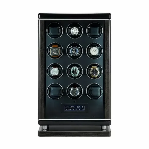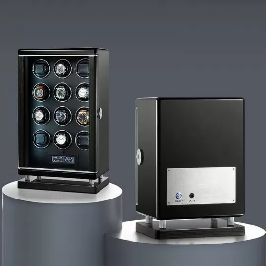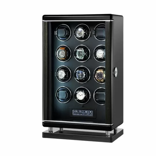 Luxury smart twelve watch winder with LCD touch screen,100% handmade exquisite workmanship, powered with Japanese super silent motor no running noise, adjustable bracket for rotating larger or heavier automatic watches, perfect gift choice.